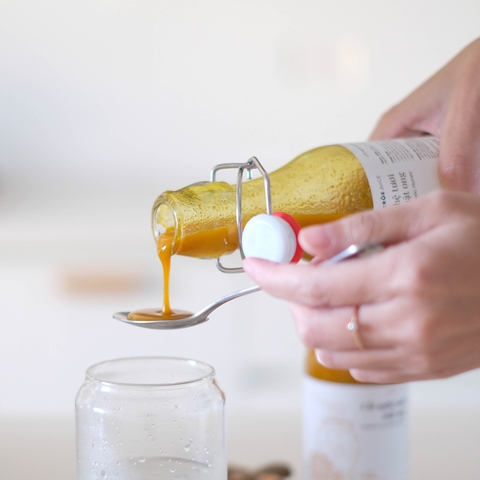 Nghệ tươi được rửa sạch, đem ép tươi bằng công nghệ máy ép lạnh thủy lực, nước cốt nguyên chất được phối trộn cùng Mật Ong tự nhiên hoa cà phê từ trang trại Lâm Đồng chọn lọc. Hoàn toàn tự nhiên, thuần chất, không sử dụng chất bảo quản, điều vị, đường tinh luyện trong toàn bộ quá trình sản xuất.